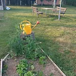 The holiday home is equipped with an electric kettle, a refrigerator, and kitchenware for self-catering in an outdoor dining area.